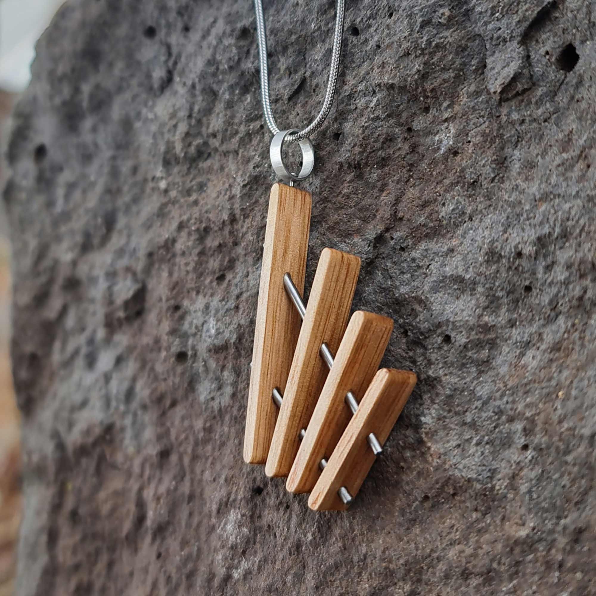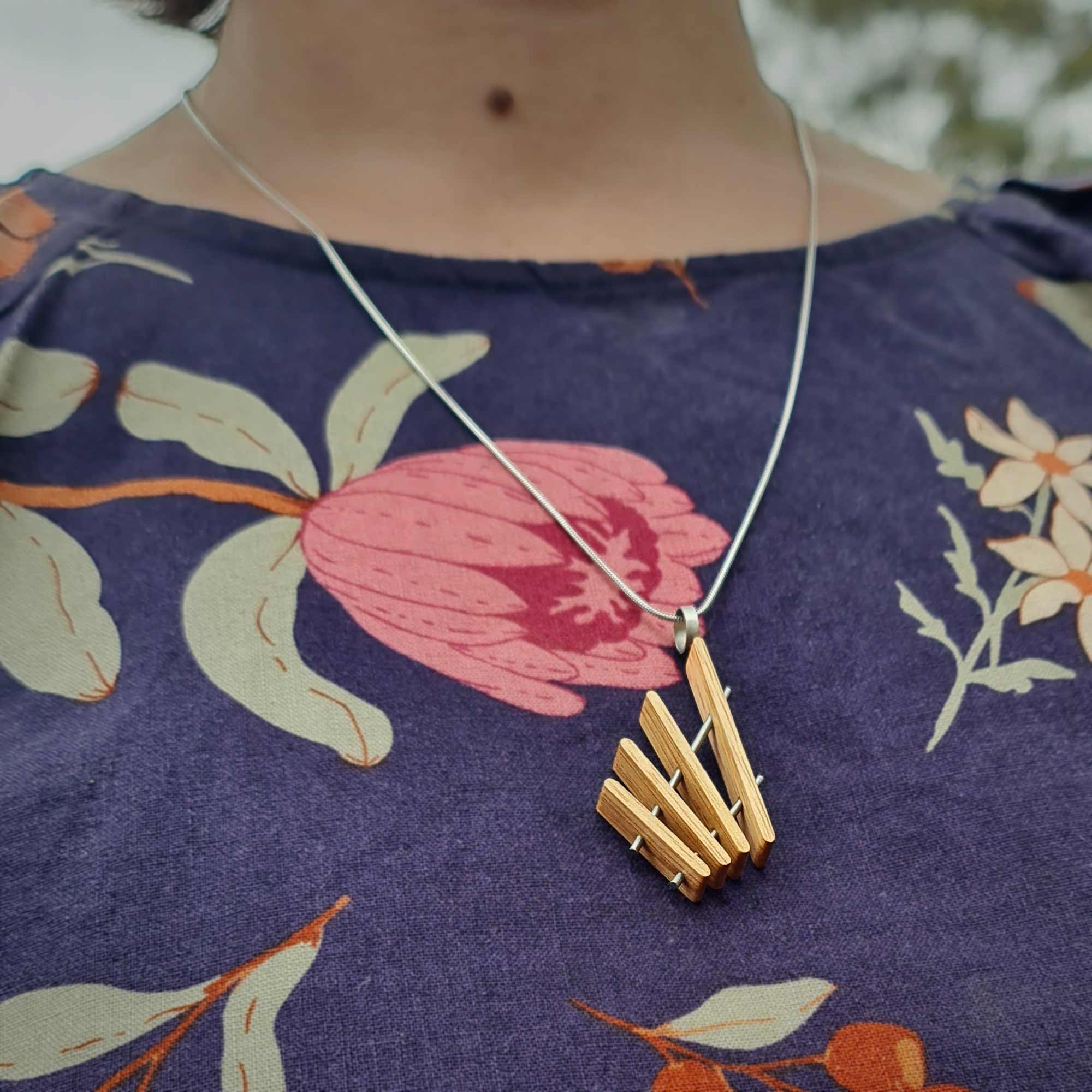 As with many of my designs, the bold array of radiating timbers bring this piece to life and create an amazing dynamic from different angles and light sources. Gaps between the timbers provide glimpses through the piece, giving this pendant an attractive lightness that really engages with and accompanies its background.