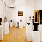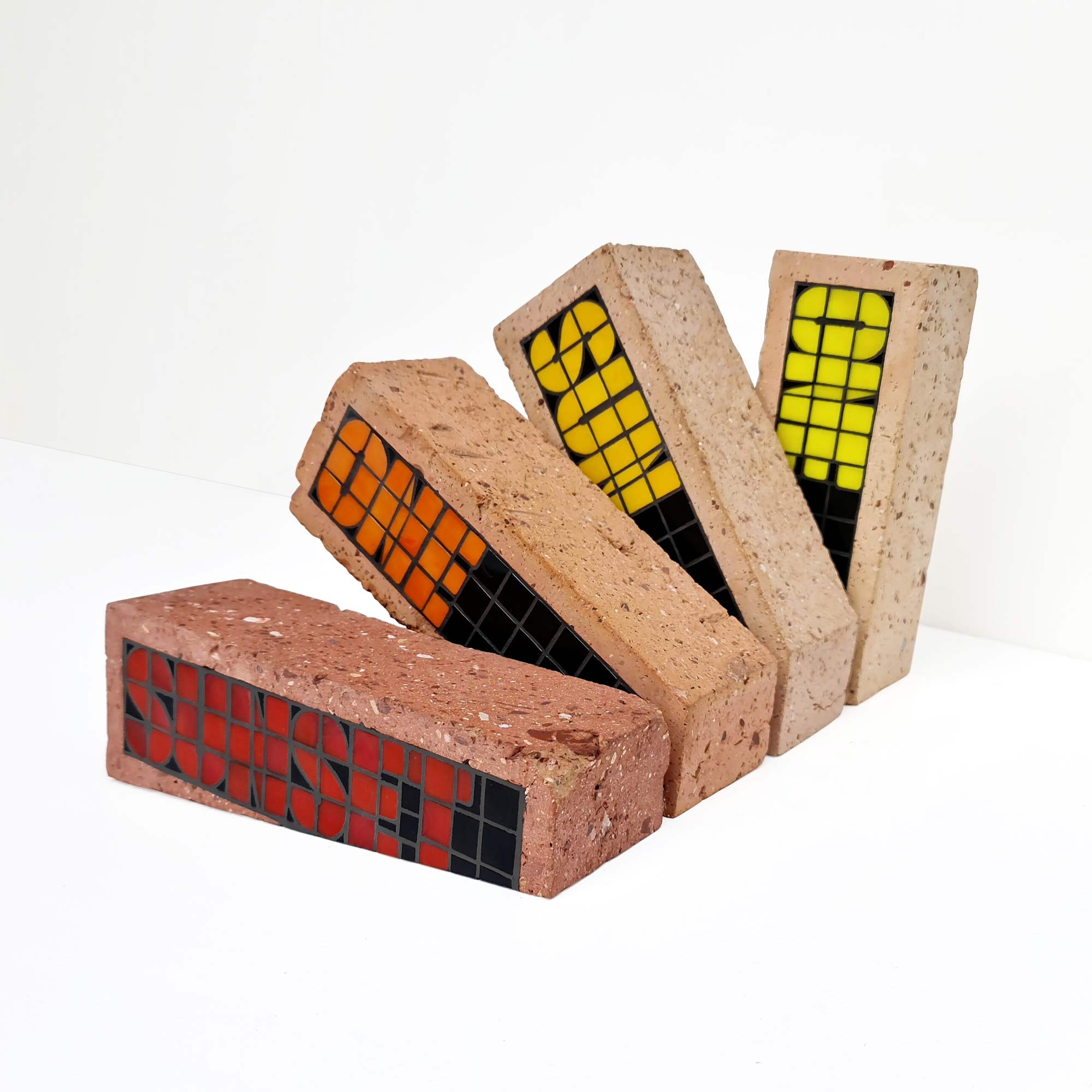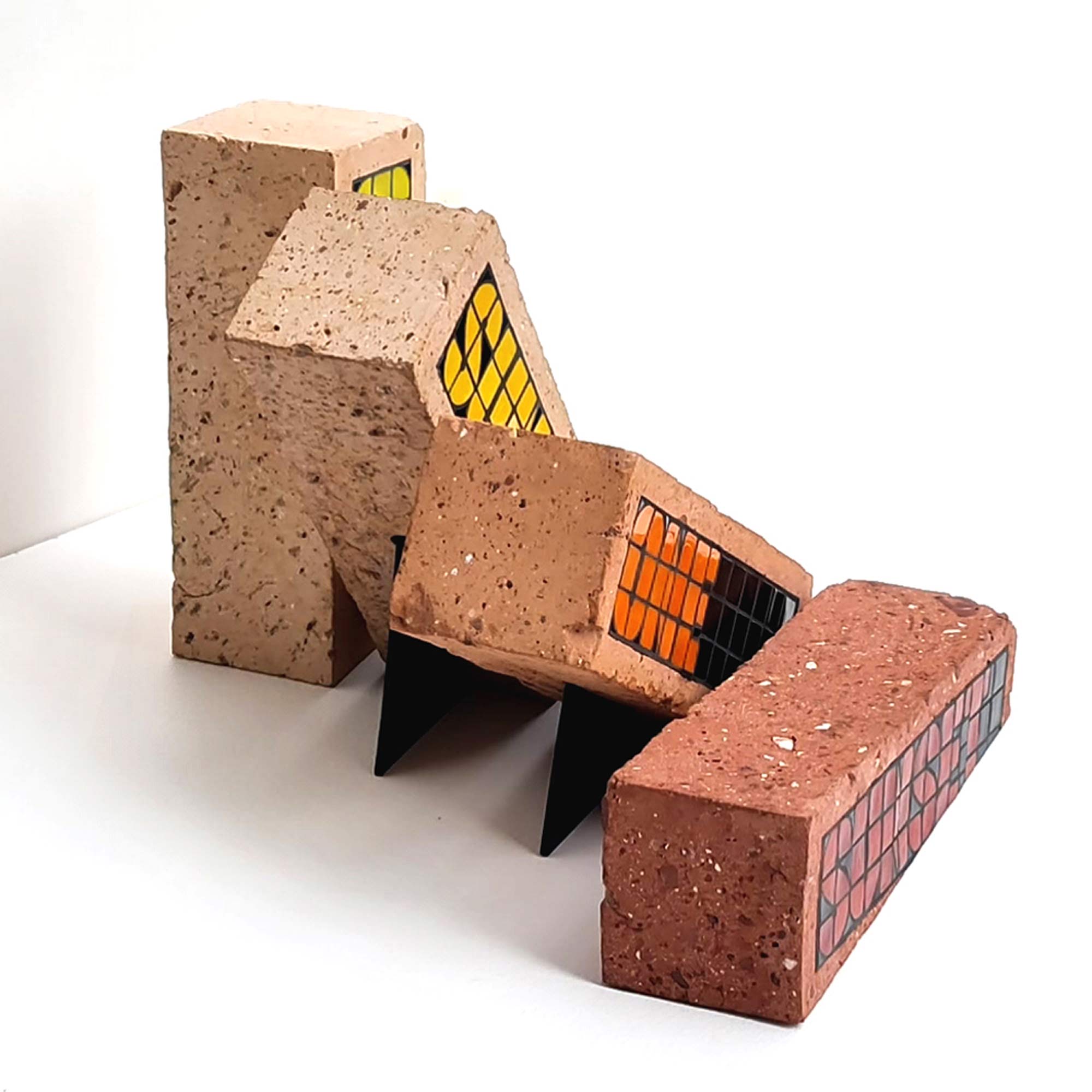 Opaque glass mosaic, remodeled antique clay bricks, galvanised steel.
